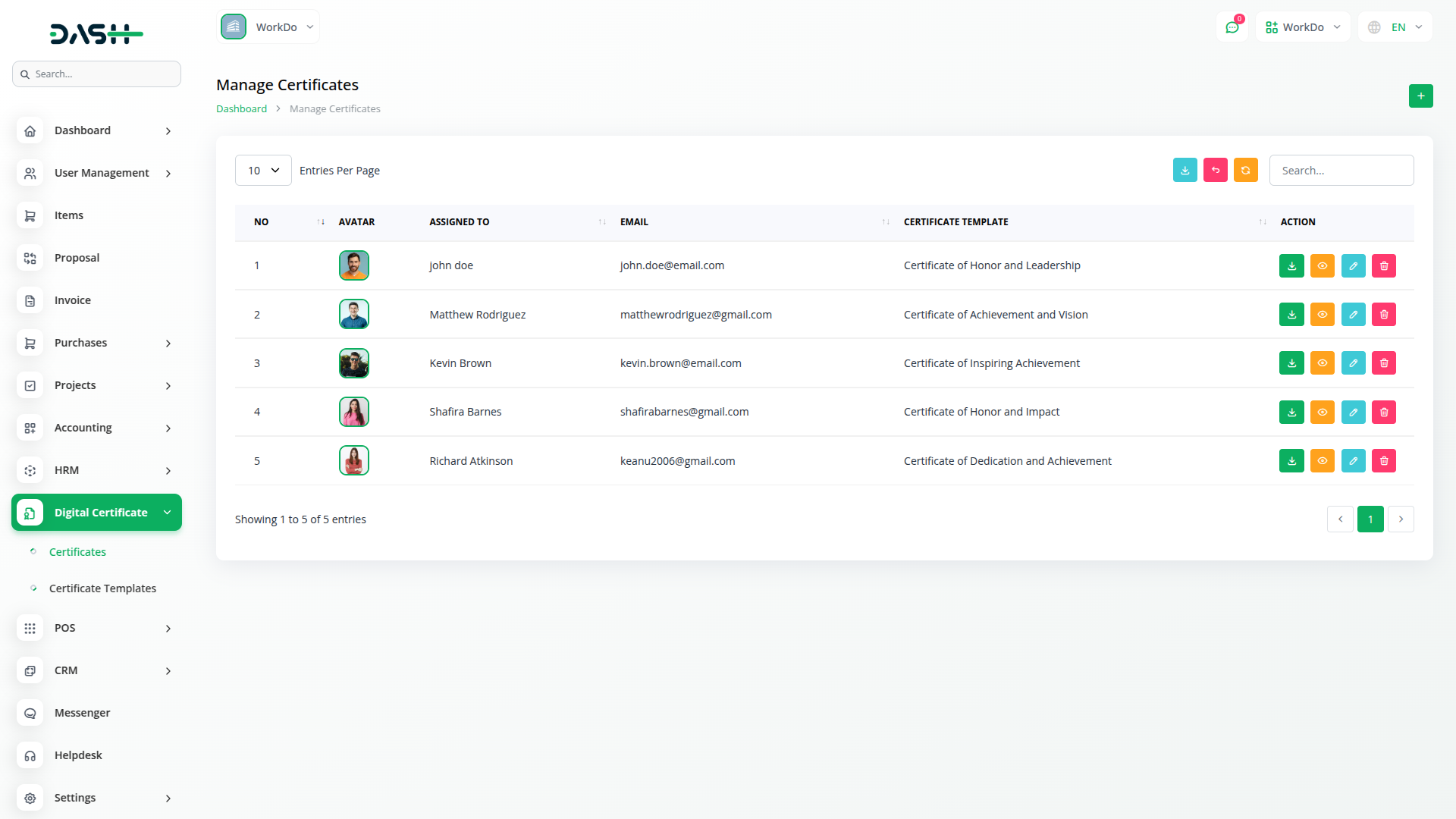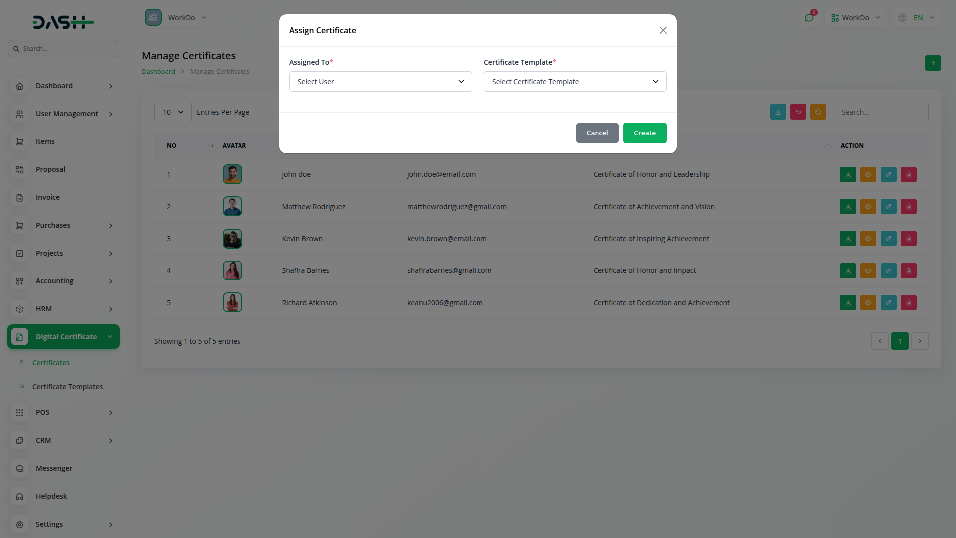 Atribui certificados de forma eficiente a usuários específicos através de um sistema integrado que se conecta com o seu banco de dados de usuários para gerenciamento de destinatários sem interrupções. Selecione destinatários e atribua modelos apropriados com base em conquistas, enquanto o sistema carrega automaticamente campos personalizáveis para personalização. Esses campos podem ser facilmente modificados para personalizar o conteúdo do certificado antes da geração final, garantindo flexibilidade e precisão. Gera certificados PDF baixáveis de alta qualidade que mantenham formatação profissional e resolução pronta para impressão adequada para documentação oficial, que preservem todos os elementos de design exatamente como pretendido.