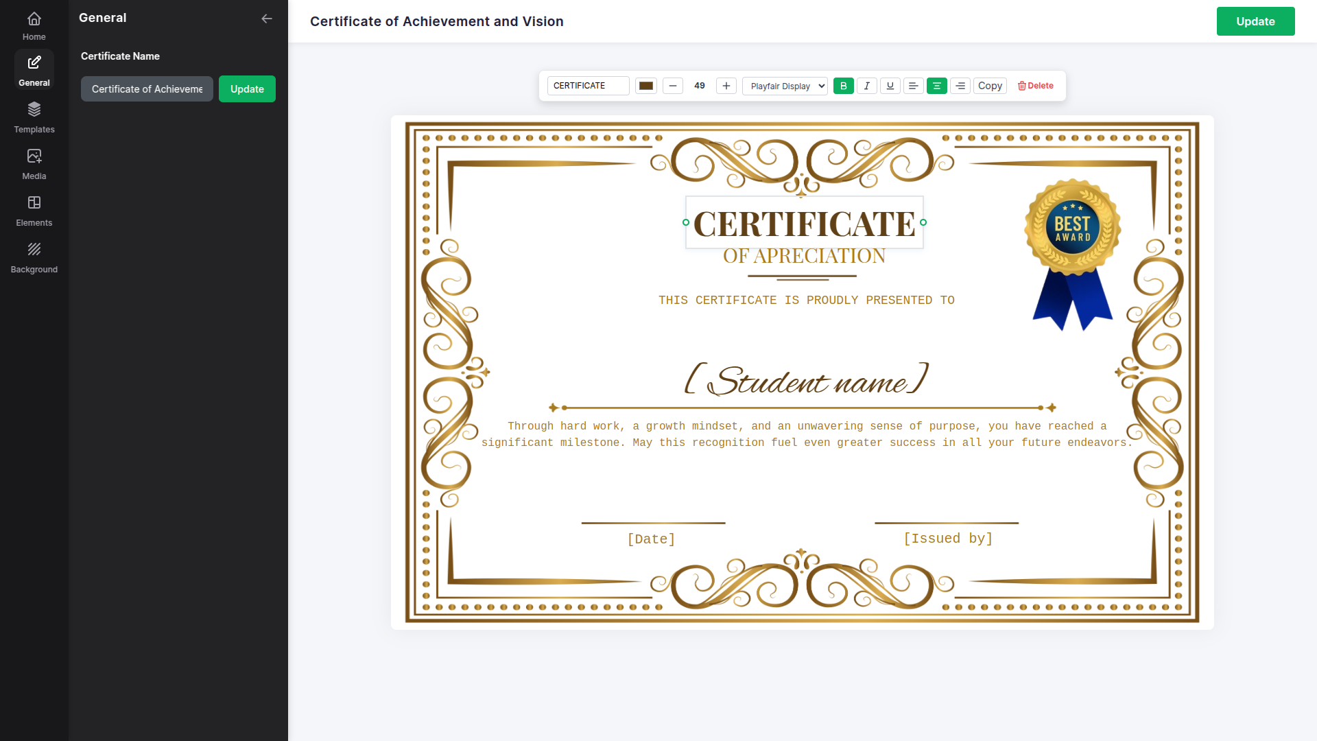 Transforme modelos estáticos em certificados personalizados com funcionalidade avançada de elementos dinâmicos. Inserir conteúdo variável, incluindo nomes, datas de conclusão, títulos de cursos, notas e detalhes de conquistas que se integram perfeitamente em seus projetos de certificados. A interface intuitiva permite o posicionamento e formatação precisos de componentes dinâmicos com opções de aparência personalizáveis, incluindo seleção de fonte, tamanho e controles de posicionamento que garantem que cada certificado atenda às suas exigências exatas de design.