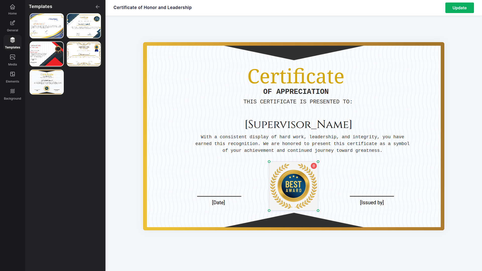 Navegue pela sua biblioteca de certificados com uma interface de visualização de grade organizada que exibe modelos em um formato visual para uma navegação e seleção eficientes. Compare projetos rapidamente enquanto otimiza o espaço da tela com visualizações claras que fornecem contexto visual para decisões de gerenciamento. Capacidades de pesquisa aprimoradas permitem uma navegação eficiente por grandes bibliotecas de modelos, facilitando a localização do projeto de certificado perfeito para qualquer ocasião ou programa de reconhecimento de conquistas.